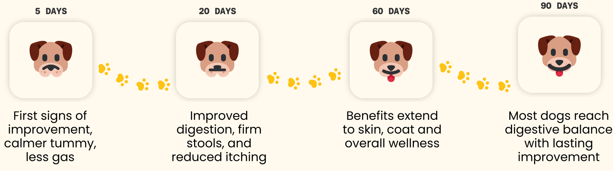 We stand behind Probiotic Plus with a no-hassle, 90 days money-back guarantee. Give your dog consistent daily support—if you don’t see a difference, we’ll refund you.